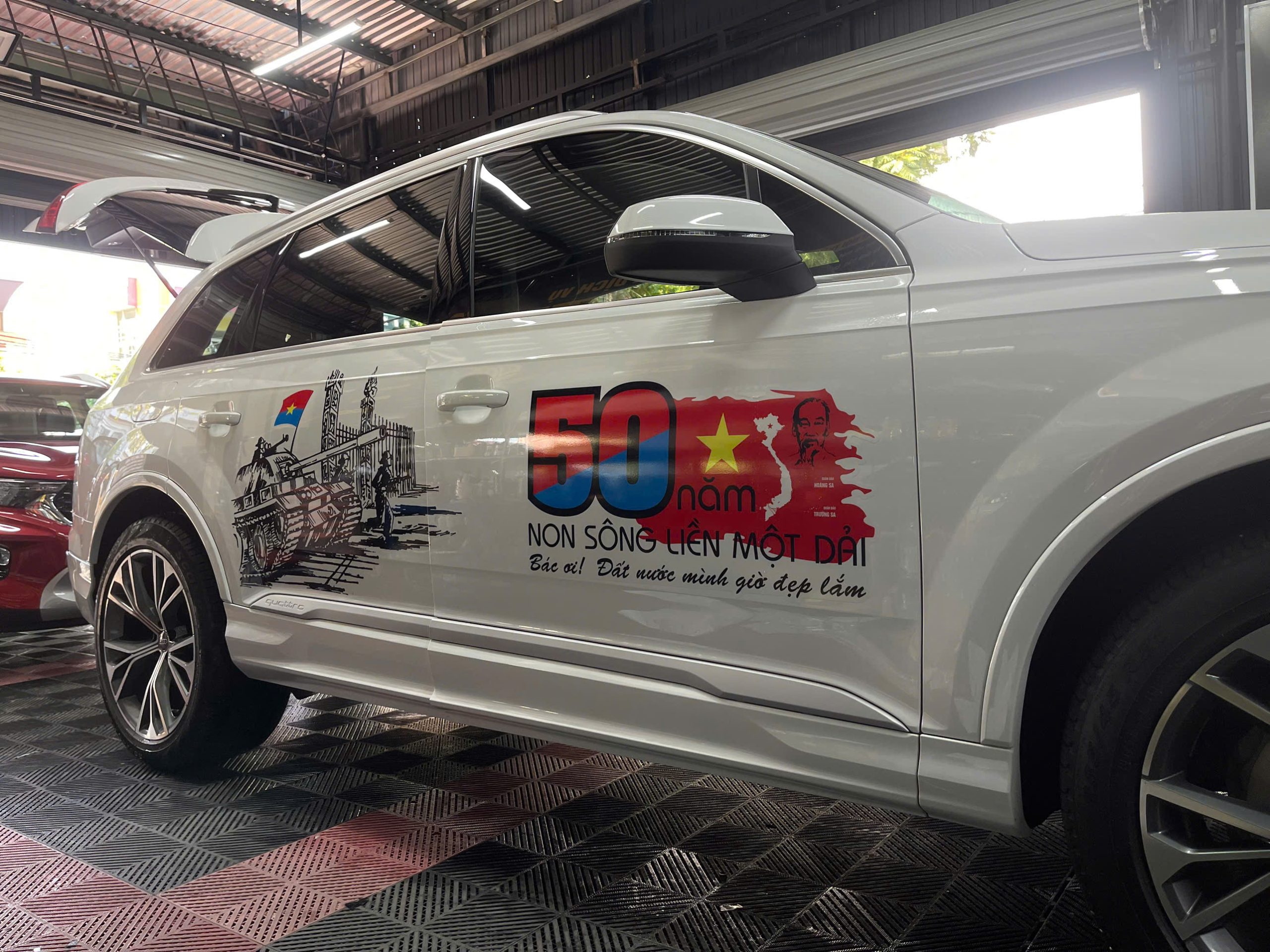 Chuyên gia sẽ tiến hành dán decal cho từng phần của xe, từ nóc xe, thân xe đến tem sườn, đảm bảo mọi chi tiết đều hoàn hảo.