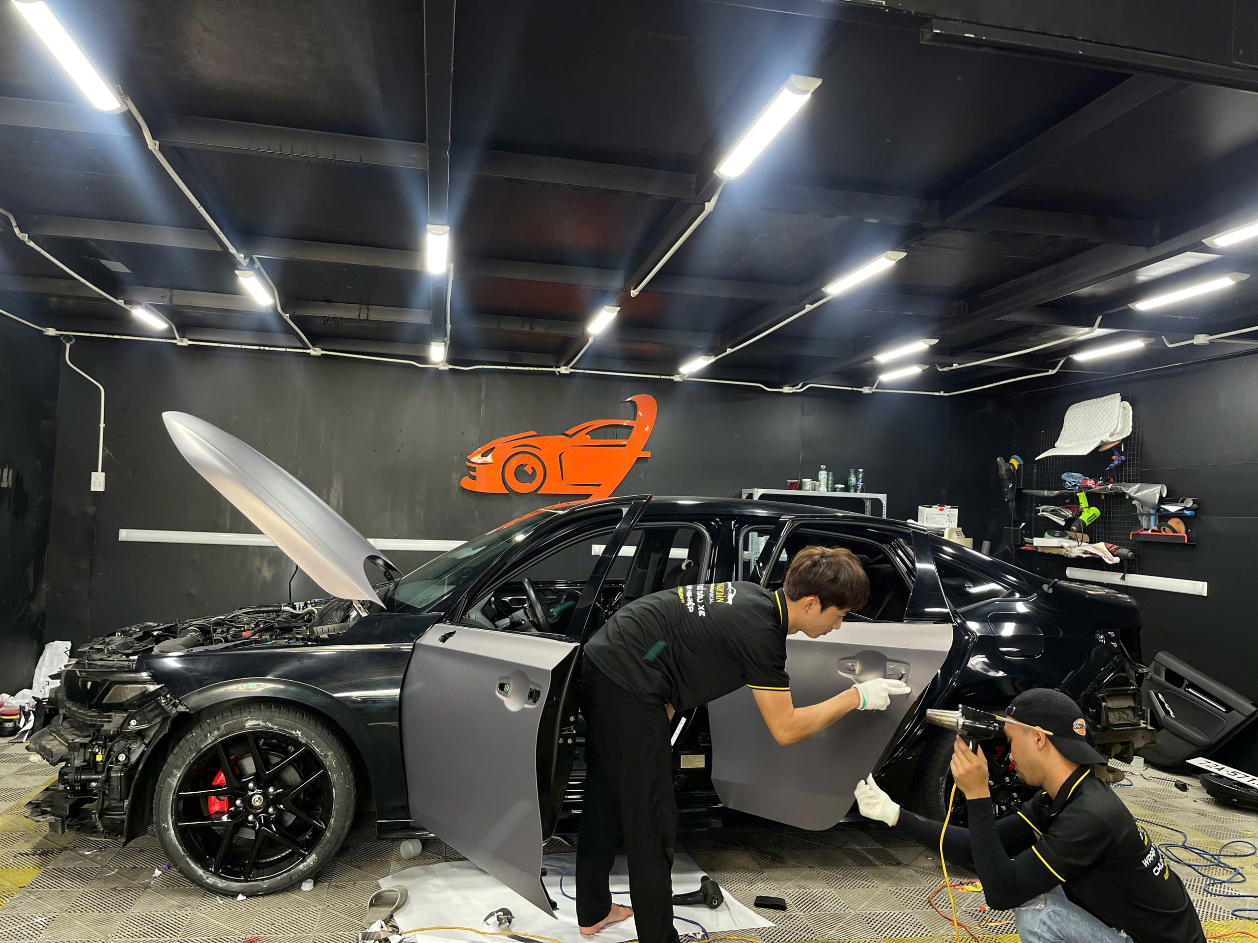 Chuyên gia sẽ tiến hành dán decal cho từng phần của xe, từ nóc xe, thân xe đến tem sườn, đảm bảo mọi chi tiết đều hoàn hảo.