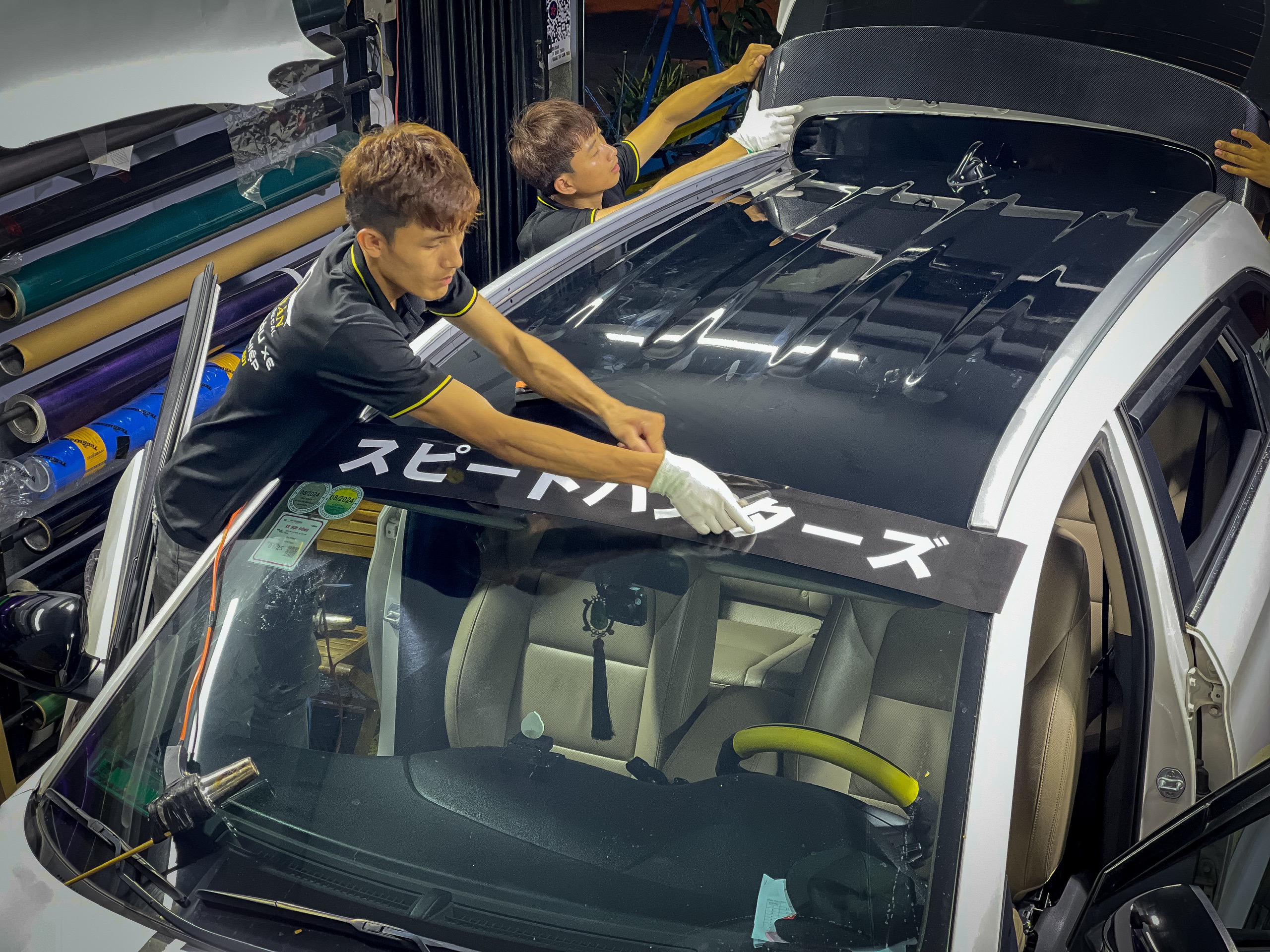 Chuyên gia sẽ tiến hành dán decal cho từng phần của xe, từ nóc xe, thân xe đến tem sườn, đảm bảo mọi chi tiết đều hoàn hảo.
