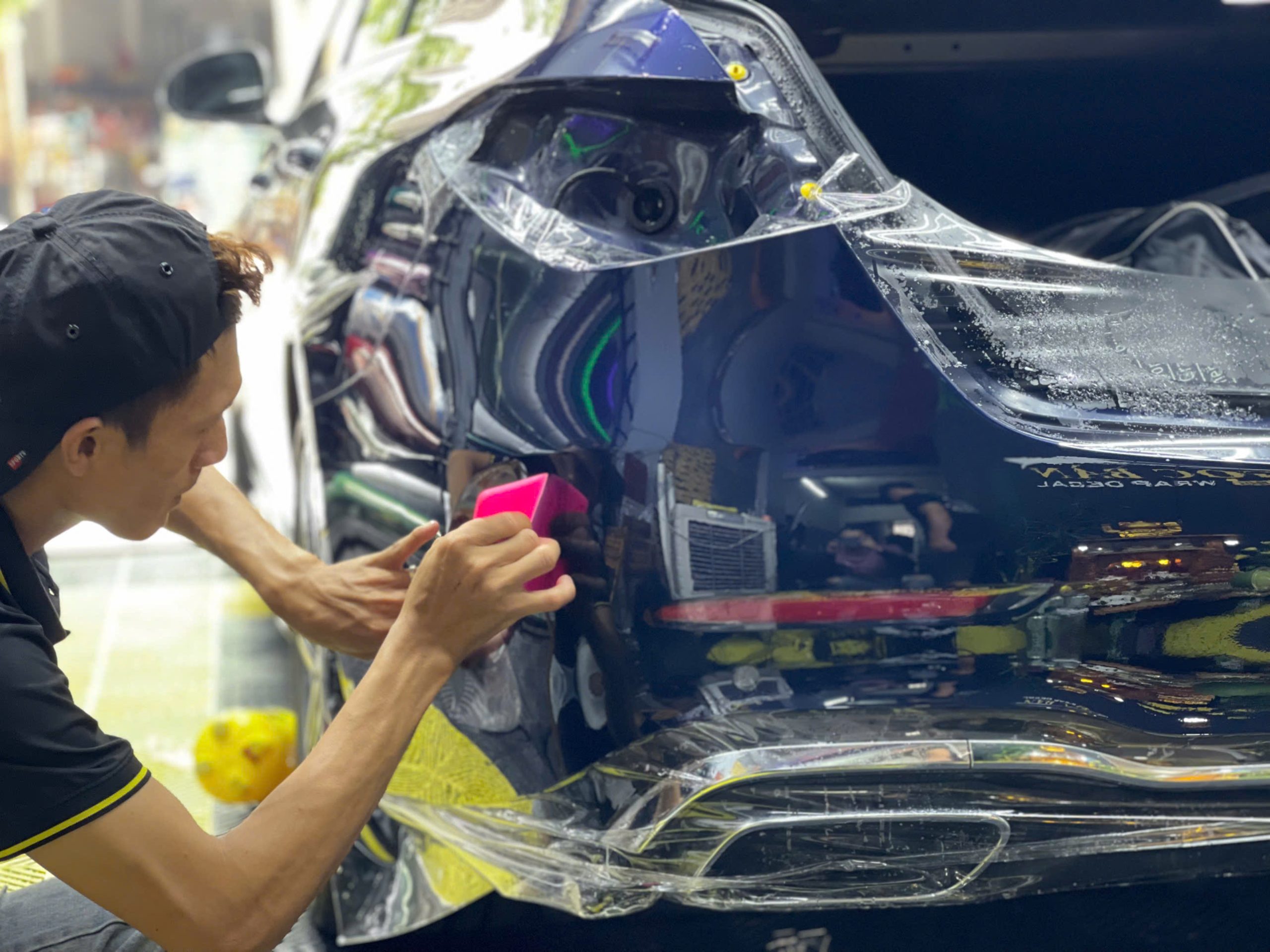 Chuyên gia sẽ tiến hành dán decal cho từng phần của xe, từ nóc xe, thân xe đến tem sườn, đảm bảo mọi chi tiết đều hoàn hảo.